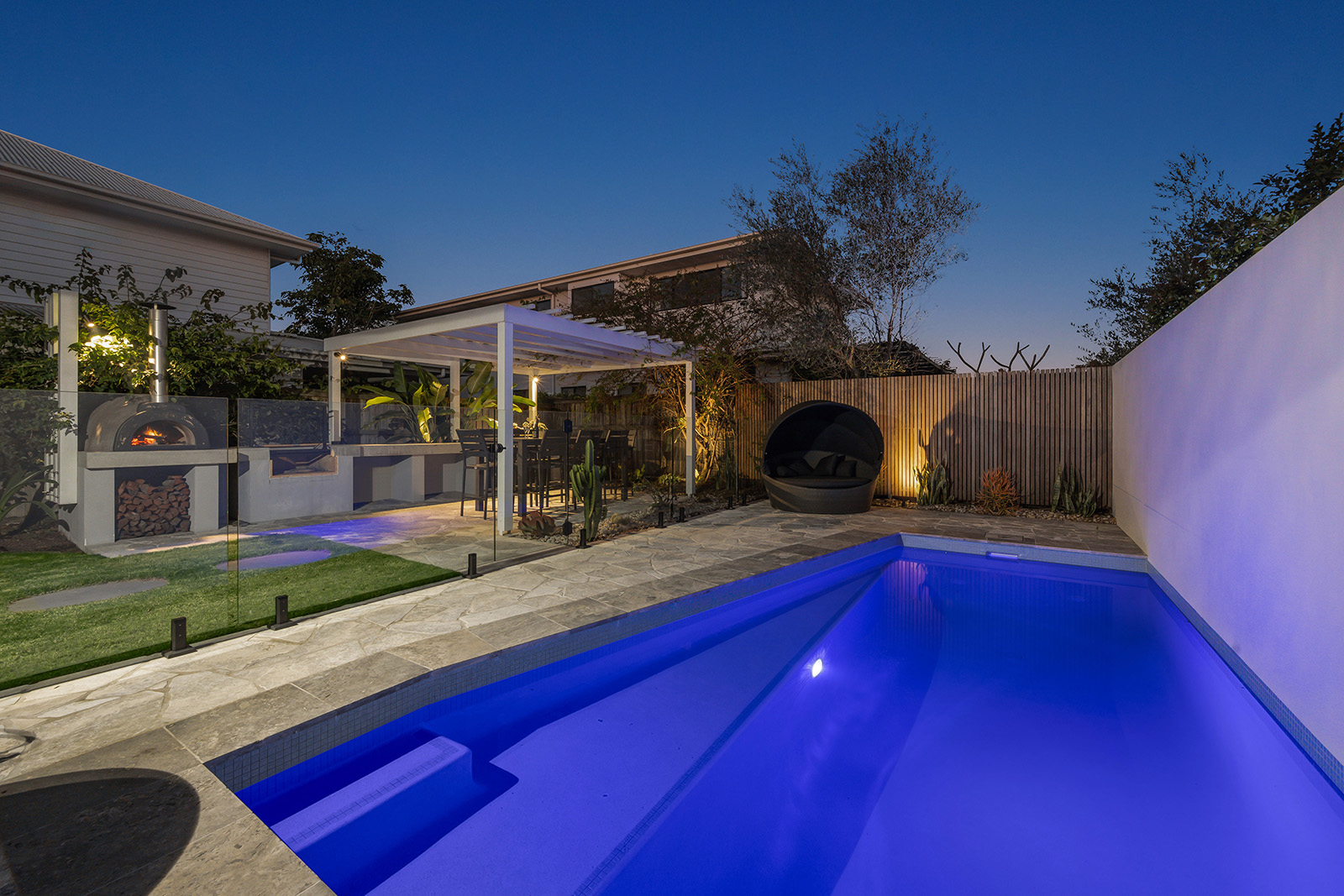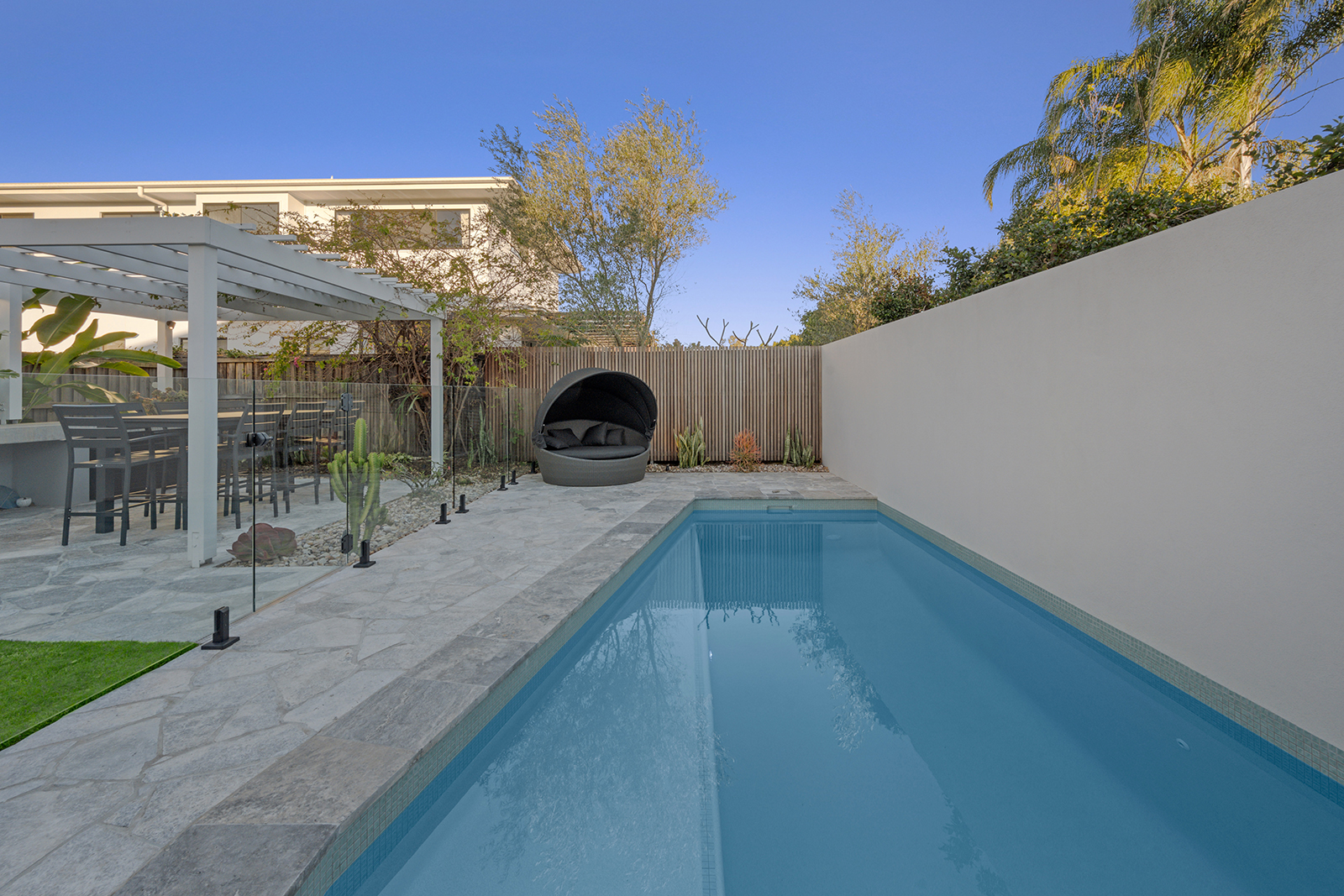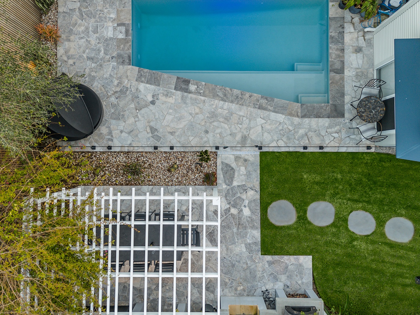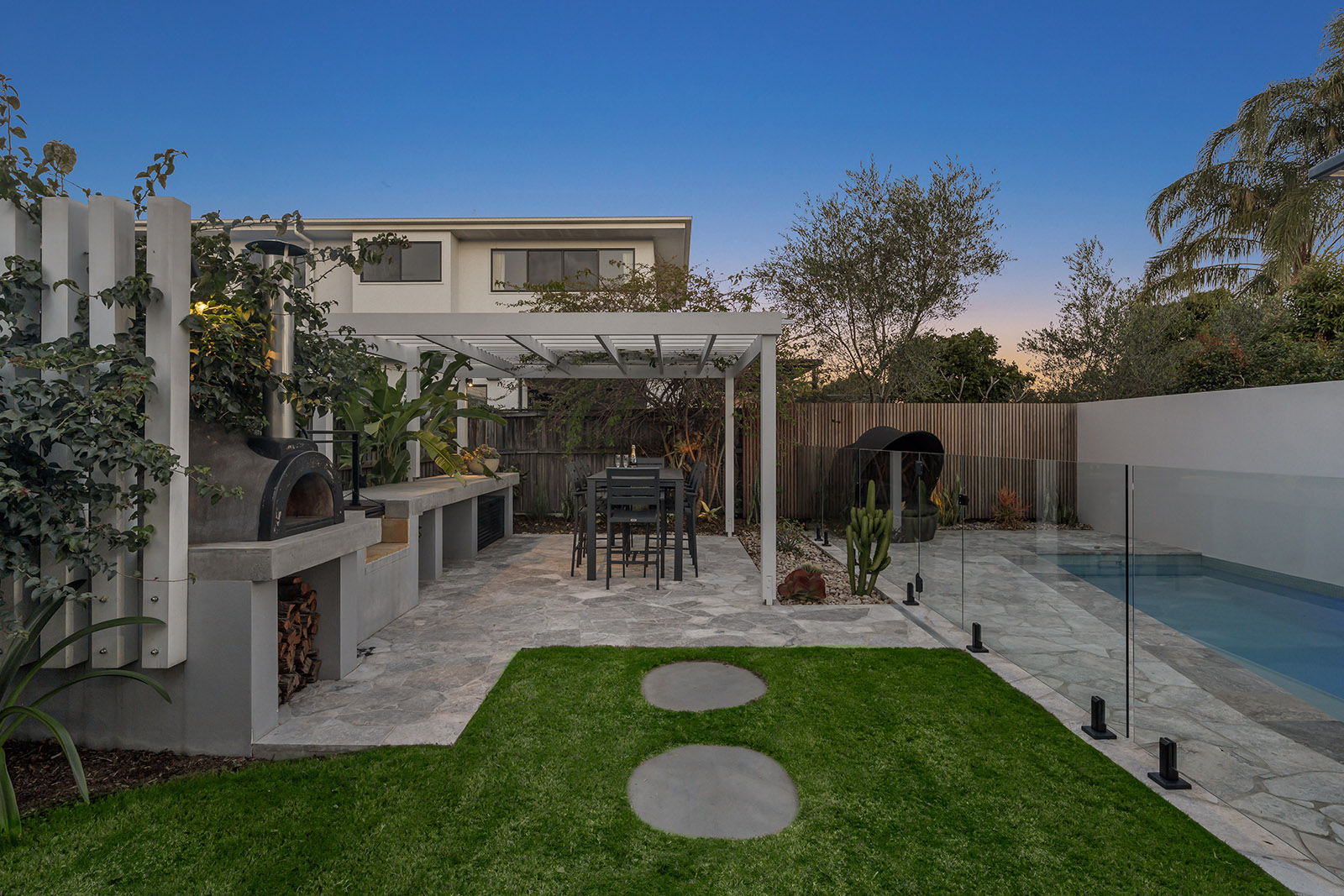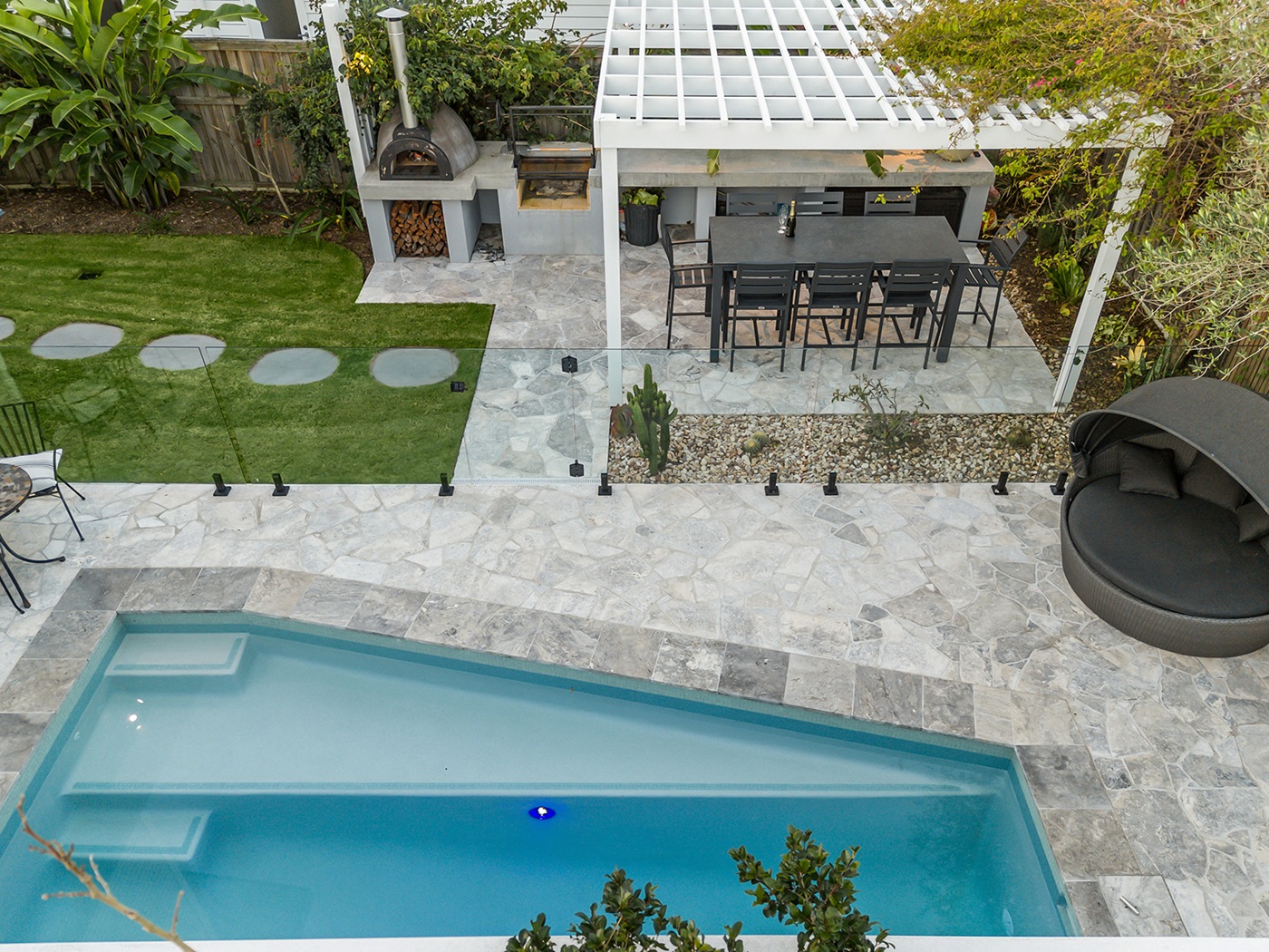 This project has a really interesting back story that demonstrates our commitment to solving problems and overcoming challenges in order to make our clients’ goals come to life. A large sewer main that runs diagonally through the backyard has dictated the shape and placement of every element of this house and backyard (as you can see from the diagonal lines of the pool and the house depicted in the aerial shots). We are proud to have designed and installed a pool that accommodates this unusual underground obstacle, as well as a low maintenance garden complete with custom timber pergola (over which our client’s Bougainvillea trails), pizza oven, and natural stone paving.