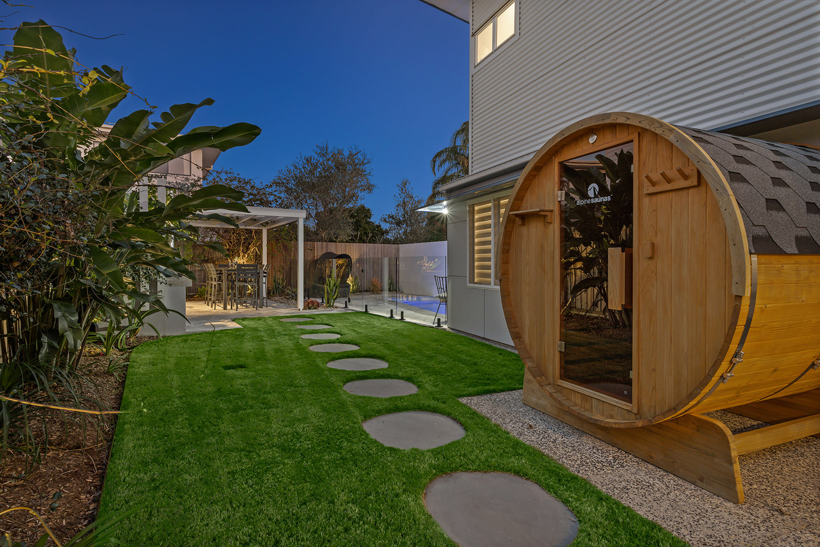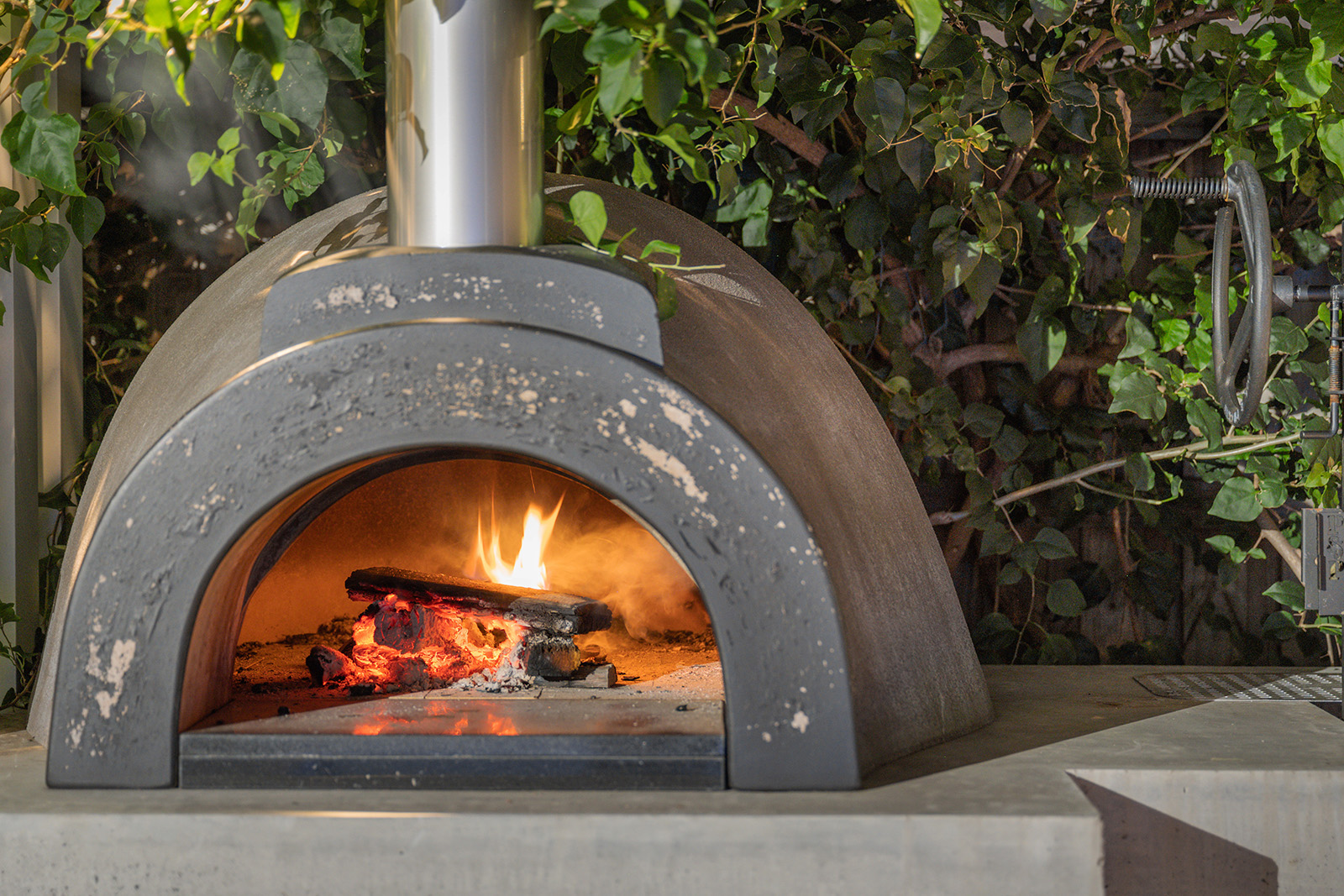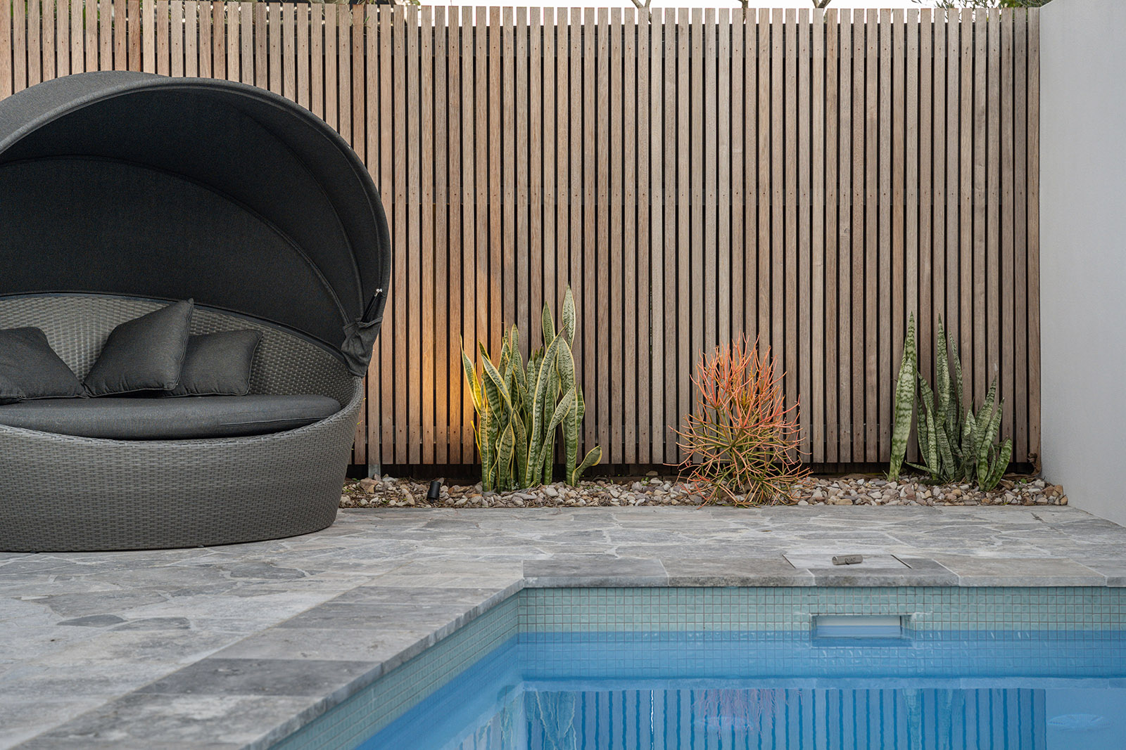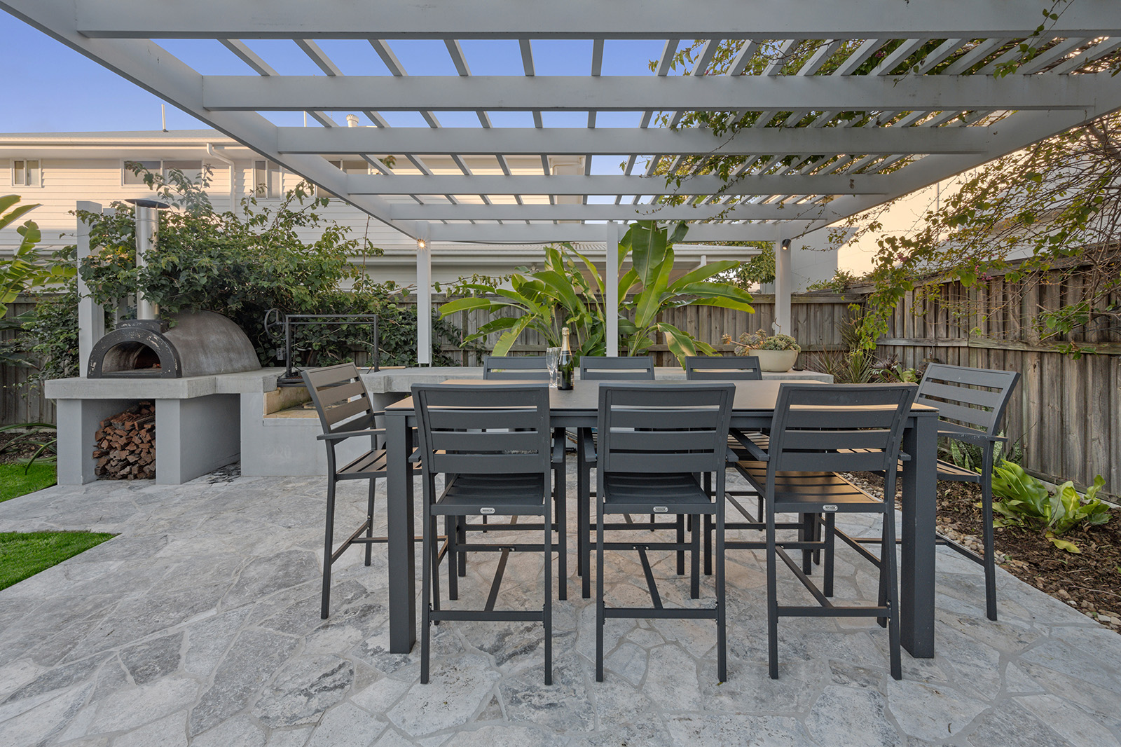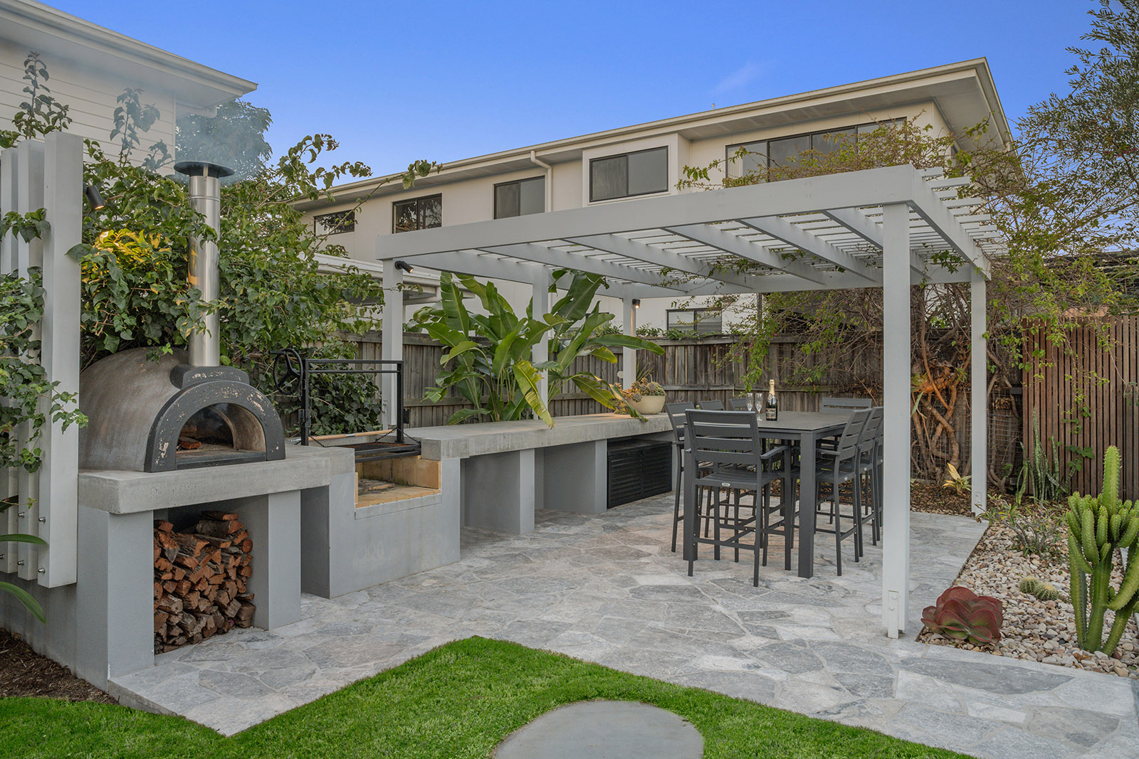 This project has a really interesting back story that demonstrates our commitment to solving problems and overcoming challenges in order to make our clients’ goals come to life. A large sewer main that runs diagonally through the backyard has dictated the shape and placement of every element of this house and backyard (as you can see from the diagonal lines of the pool and the house depicted in the aerial shots). We are proud to have designed and installed a pool that accommodates this unusual underground obstacle, as well as a low maintenance garden complete with custom timber pergola (over which our client’s Bougainvillea trails), pizza oven, and natural stone paving.